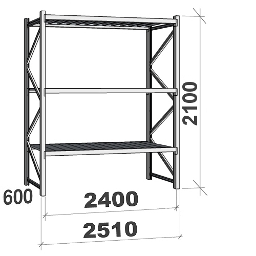 - Komplekti kuuluvad 2 külgraami 2100x600 mm ja 3 riiulitasapinda 2400x600 mm, tsingitud metallist riiuliplaatidega.
