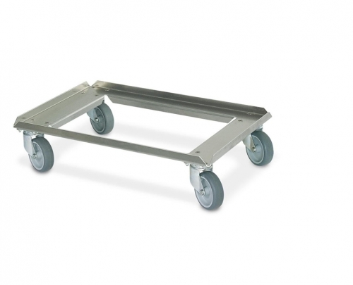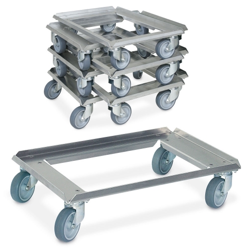 Lightweight and durable aluminum transport trolley for Euro boxes. This box trolley is designed for 600×400mm Euro boxes or two 400×300mm boxes. Suitable for the food industry, manufacturing, logistics and e-commerce. Four smooth-running 360 degree ball-bearing wheels make handling easy. The open platform has a low edge that prevents the boxes from slipping.