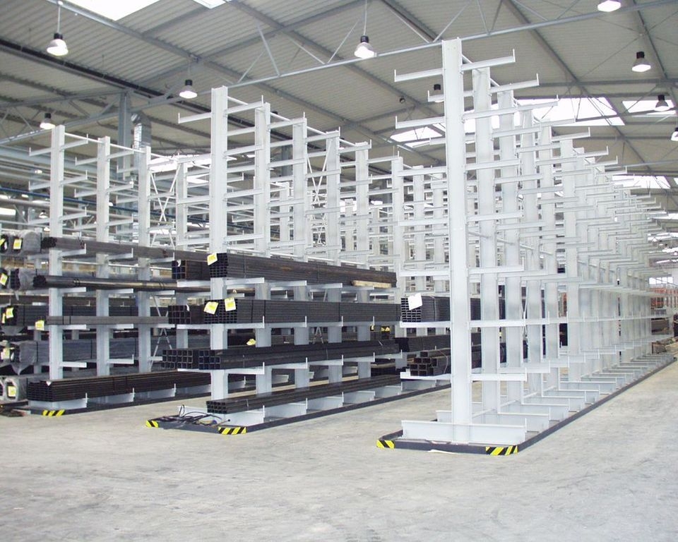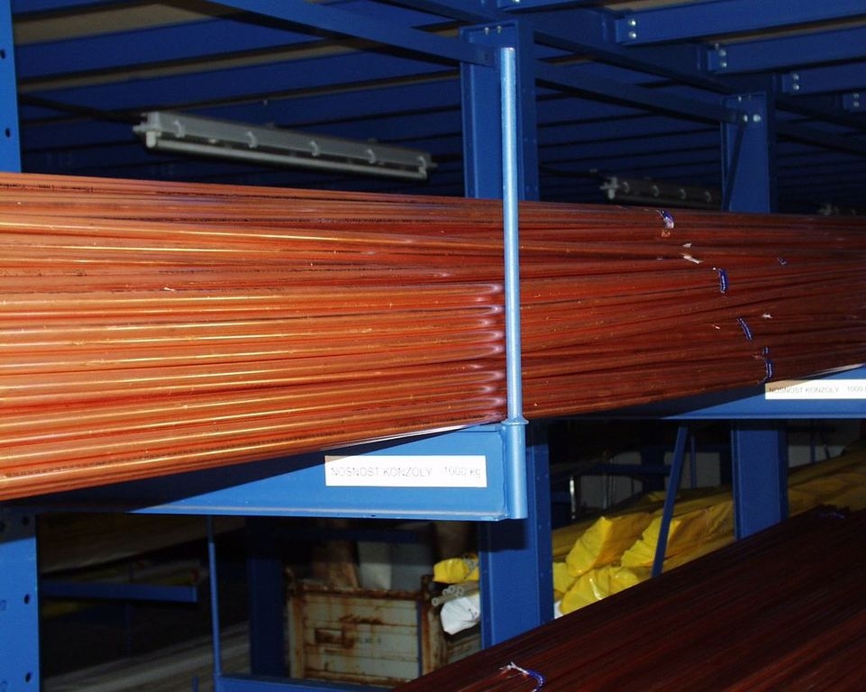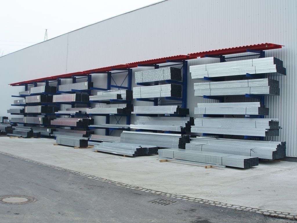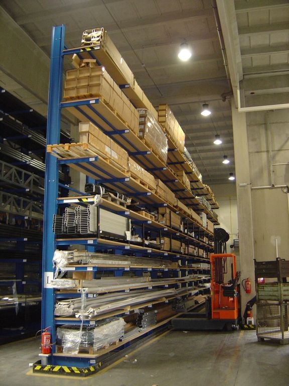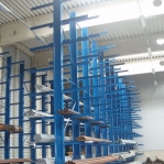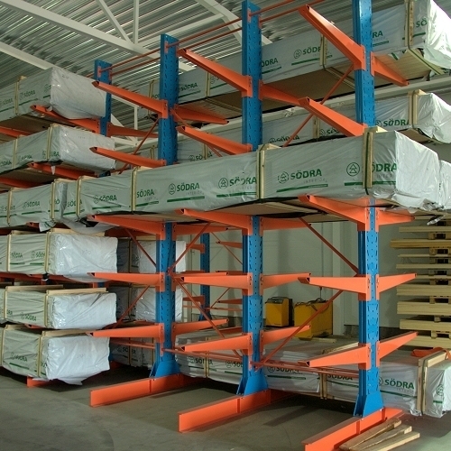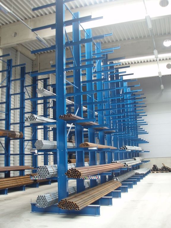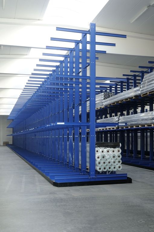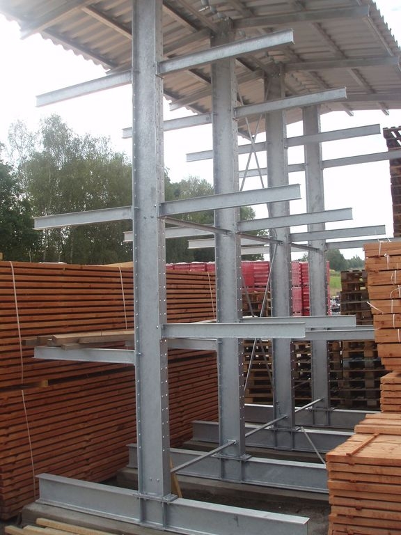 Cantilever racks are designed for the effective storage of goods such as wooden boards or pipes, separation of standing long goods. Due to the possibility of double-sided suspension or use, cantilever racks are characterized as space-saving racks that meet almost every requirement in your warehouse. You can buy cantilever racks in our store in two versions : HEAVY rack - steel powder coated upright in blue, cantilever arms in orange or MEDIUM rack - fully galvanized sheet metal. We realize also individual cantilever racks on request in the form of custom-made products - especially for your individual needs. Please take into account that this may result in longer delivery times. The single-sided or double-sided cantilever racks can be fixed to the floor with the help of bolt anchors. Due to the modular design, you can also expand single-sided and double-sided cantilever racks with additional arms or bays at a later date. The arm load, or the load capacity, of our cantilever racks ranges from 300 kilograms to 1200 kilograms, depending on the system. The standard height of our long goods racks depending on the selected variant, are from 2 to 5 meters.