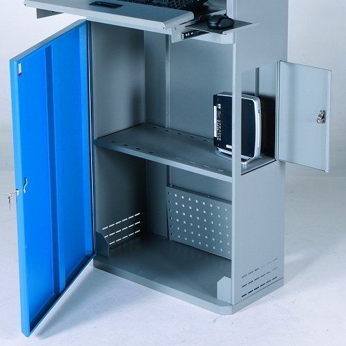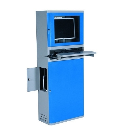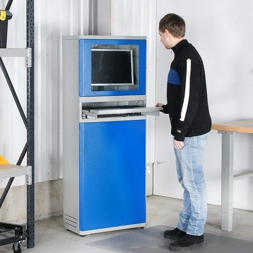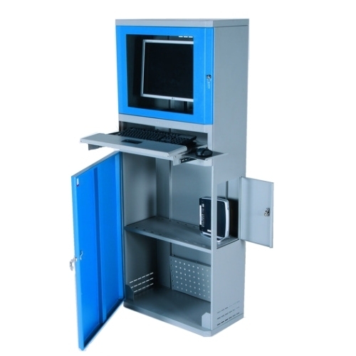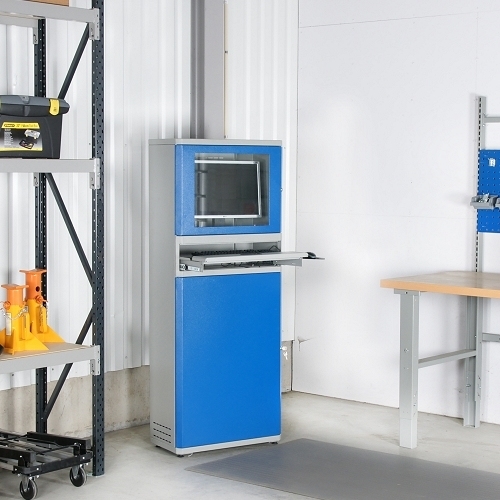 - The cabinet is equipped with a keyboard shelf and a terminal window for screens of up to 19 inches.