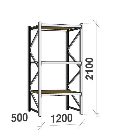 The kit includes 2 side frames 2100x500 and 3 shelf levels 1200x500 with two horizontal beams and 22 mm chipboard plate.