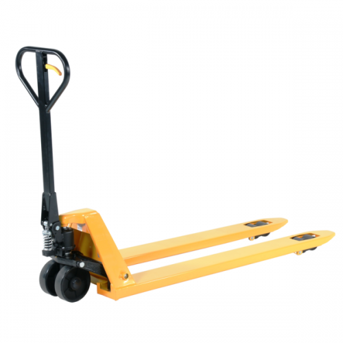 A new range of hand pallet trucks with long forks for handling of long goods or several pallets simultaneously. They are heavily reinforced to handle cargo up to 2 tons. They are equipped with polyuretane wheels to make it easier to get around on uneven ground as well as over smaller obstacles such as stone and debris that may be on the floor. Poluyretane wheels make the carriage quiet and smooth.