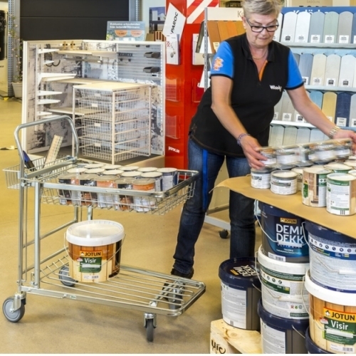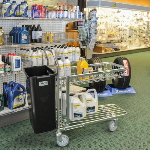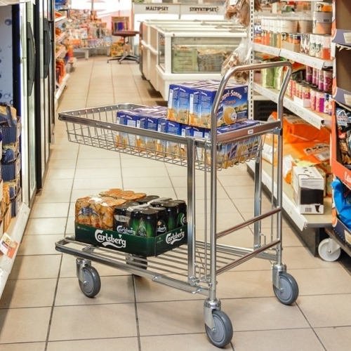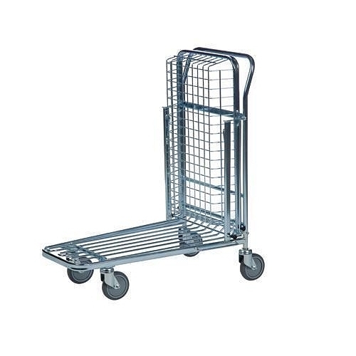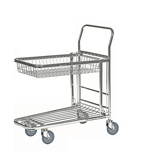 - Nestable in store/warehouse trolley with a basket that can be tilted up.
