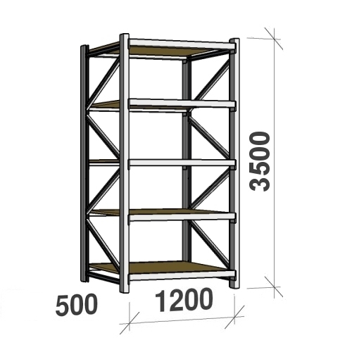 - The kit includes 2 side frames 3500x500 and 5 shelf levels 1200x500 with two horizontal beams and 22 mm chipboard plate.