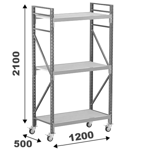 The kit includes2 side frames 2100x500 and 3 shelf levels 1200x500 with two horizontal beams and 22 mm chipboard plate + a set of 4 swivelling wheels - 100 mm castors with brake.